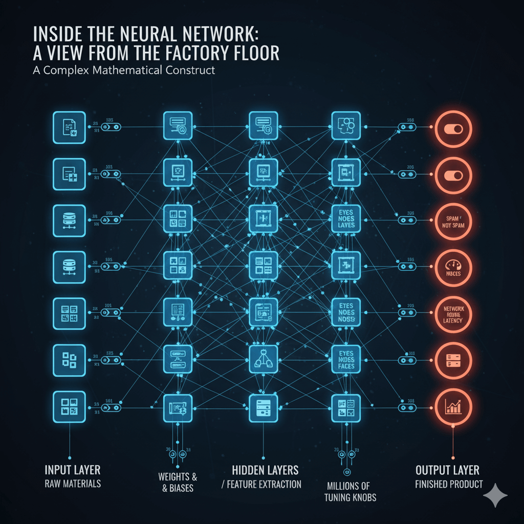 - Neural Networks as Engineering Systems: A neural network isn't magic; it's a complex mathematical function. Viewing it as a factory assembly line—with an input layer (raw materials), hidden layers (workstations), and an output layer (finished product)—demystifies how it works.